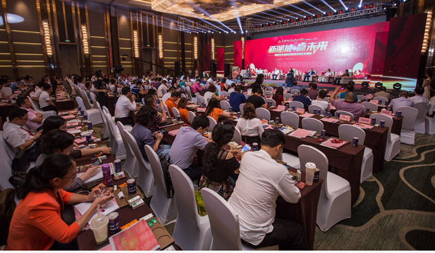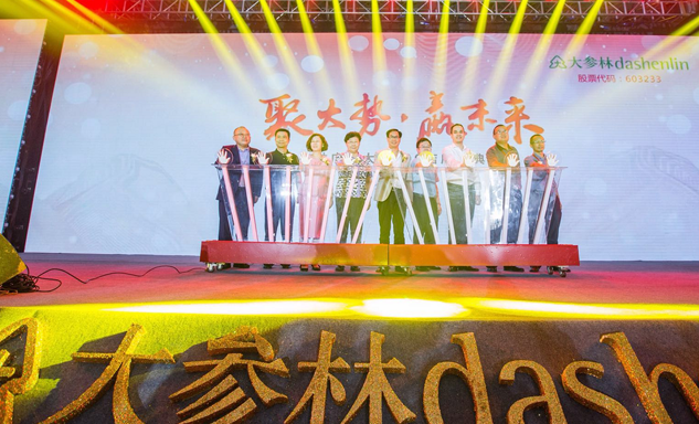 918搏天堂药业集团董事长刘景萍女士与大参林医药集团董事长柯云峰先生、中国医药商业协会执行会长付明仲女士等嘉宾共同开启了“聚大势•赢未来"大参林工商合作峰会的大幕。