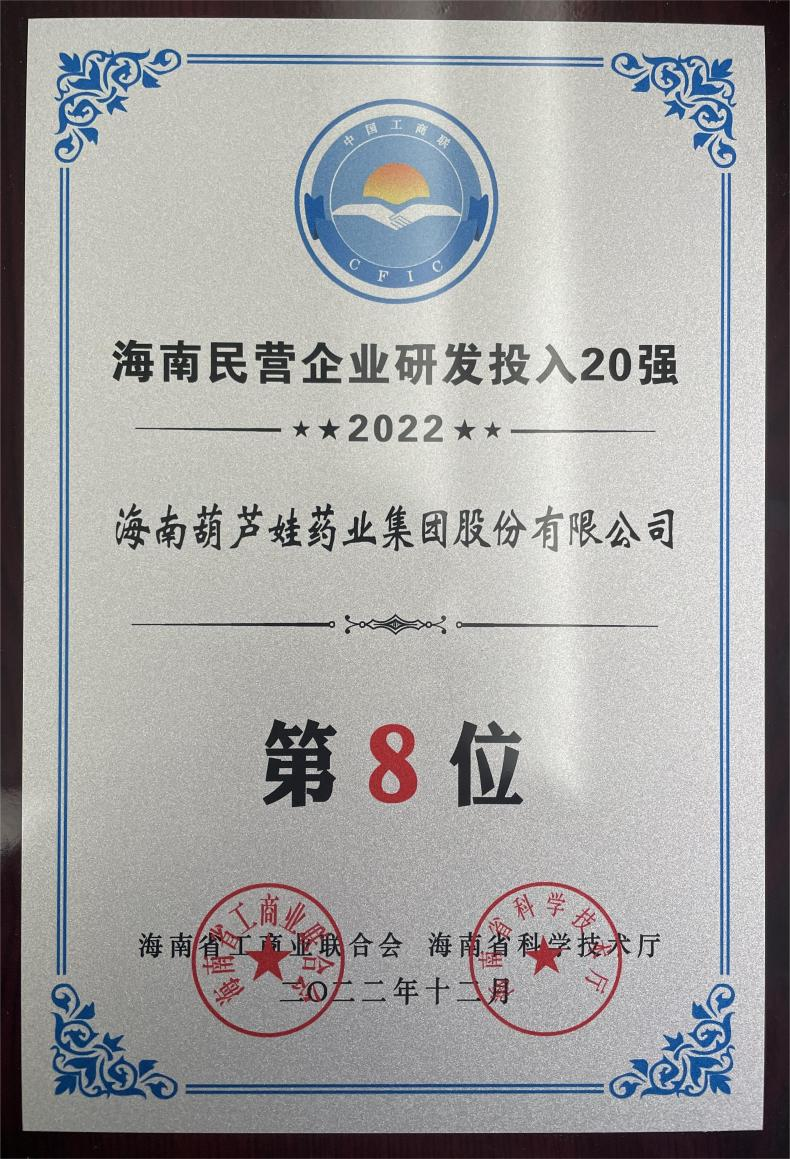 12月23日,2022海南民营企业50强和研发投入20强发布会在海口举行。会上发布了“2022海南民营企业50强”“2022海南民营企业研发投入20强”榜单和分析报告。918搏天堂药业再次荣登两榜,在海南民营企业50强榜单中位列第25位,较去年上升8位,这也是公司连续三年登榜;在海南民营企业研发投入20强中位列第8位,较去年上升7位。